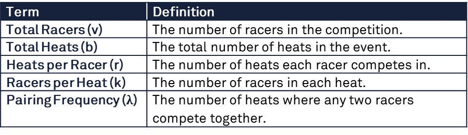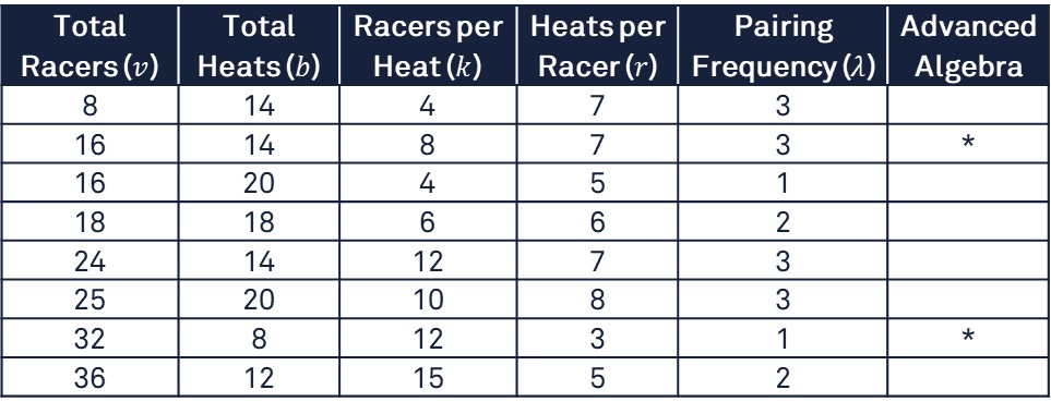 Once a valid BIBD is established, scheduling matrices can streamline the fair allocation of heats. BIBD configurations can be adapted to almost any combination of racers, heats, and other parameters set by event organisers, allowing for tailored competition structures. The table below represents just a sample of possible designs.