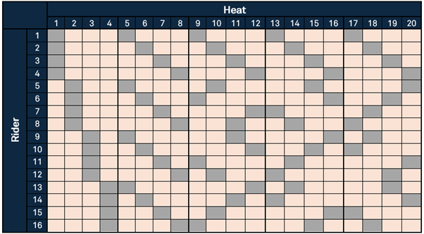 14 In the heat and rider table above, the bold borders appearing every four heats indicate that each rider has completed one race. From a broadcast perspective, these bold lines also mark natural breaks in the action, providing opportunities for punditry and athlete recovery.