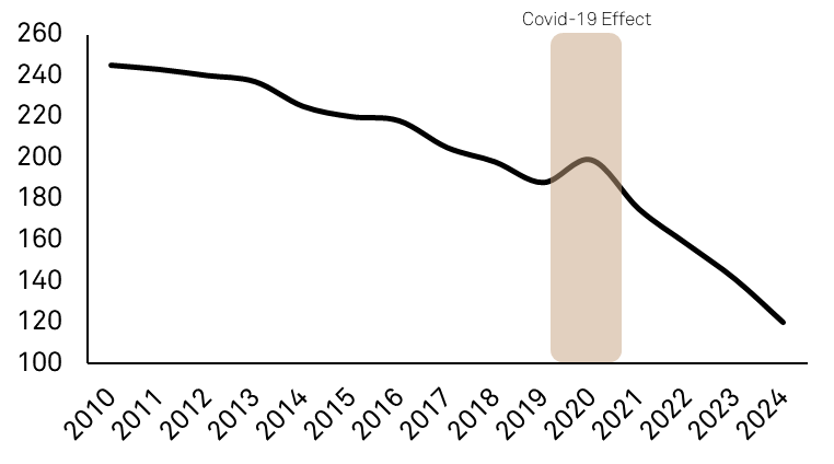 Decline in Average UK Linear TV-Viewing Minutes per Day (2010-2024)